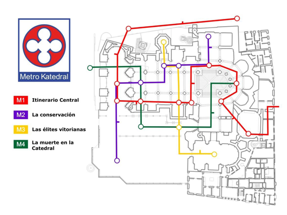 Se trata de estructurar la visita a la Catedral como si se tratara de una red de metro que tiene líneas/itinerarios que conectan diferentes estaciones/espacios, y siempre vinculadas temáticamente. Hilos conductores de las líneas de circulación que recorren el templo en distintas direcciones creando una red de interrelaciones, recorridos y contenidos temáticos que harán más versátil la visita turística al templo. En una primera fase se contempla un itinerario central, y tres más centrados en la conservación, las élites vitorianas y la muerte en la catedral.